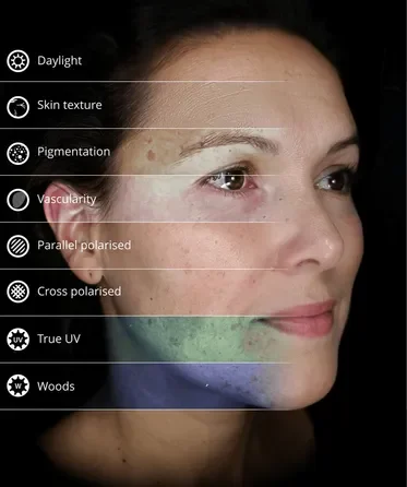 Multiple images are captured using polarised light and multi-spectral technology to reveal all skin layers.