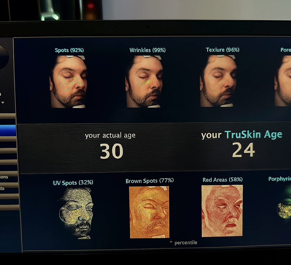 The VISIA Skin Analysis System is the world's most advanced multi-spectral skin imaging technology, providing a comprehensive assessment of your skin's biological age and health. This cutting-edge diagnostic tool captures high-resolution images using multiple wavelengths of light to reveal skin conditions that are invisible to the naked eye.